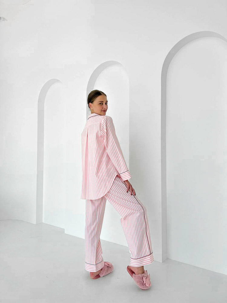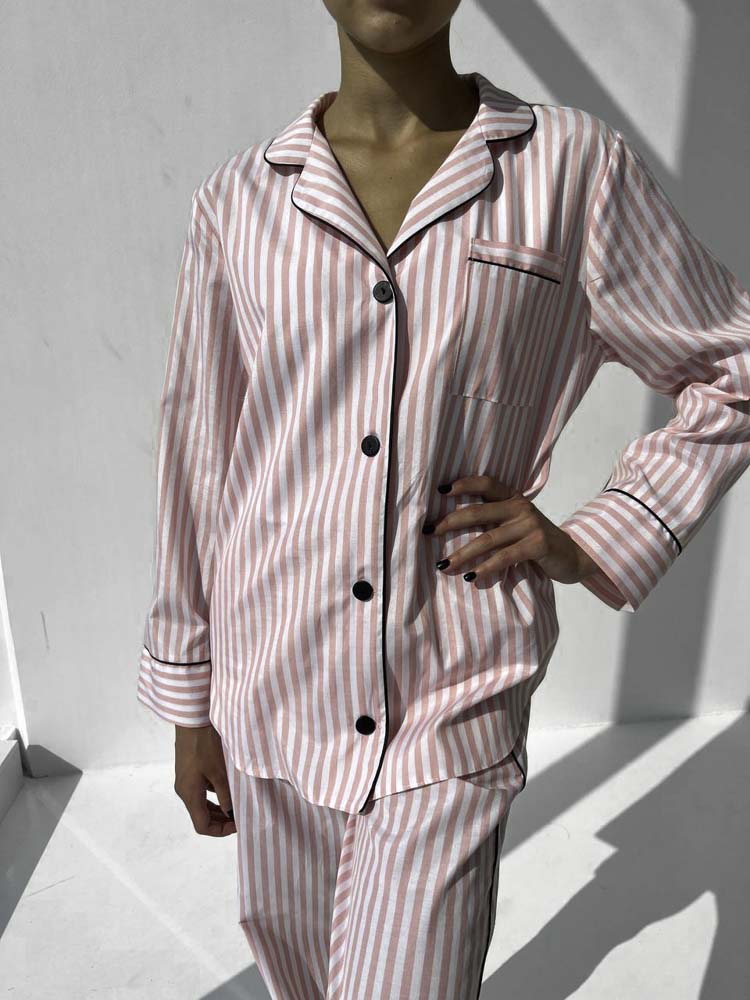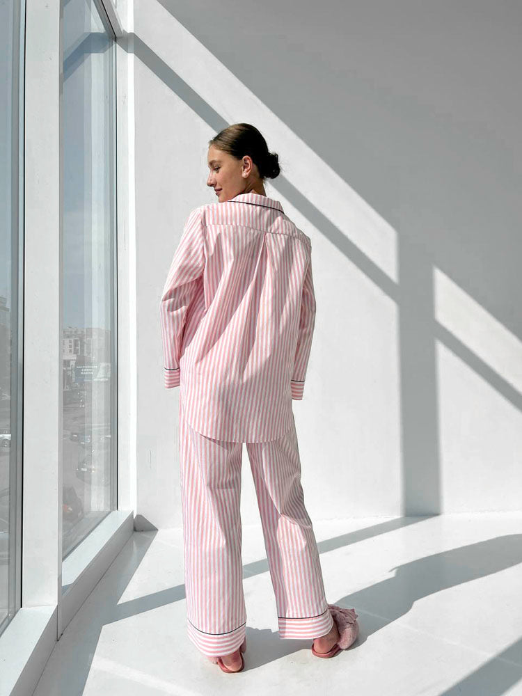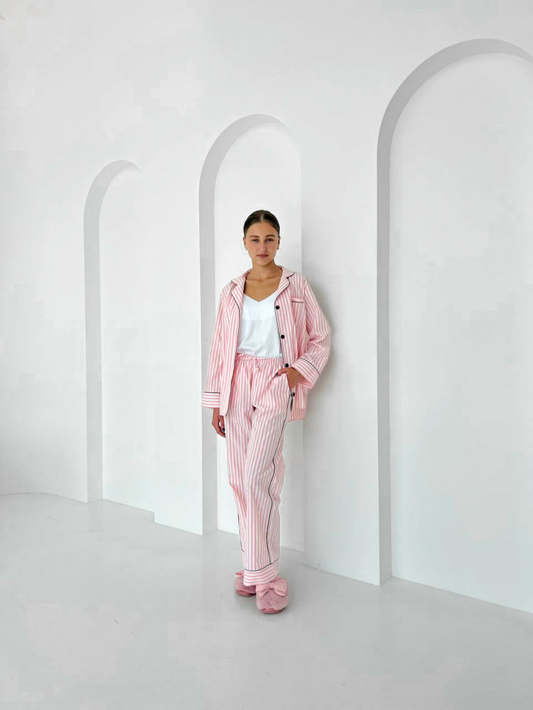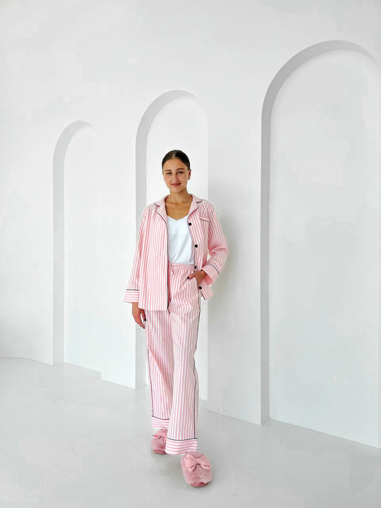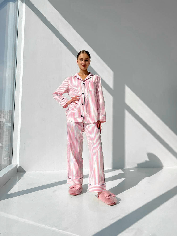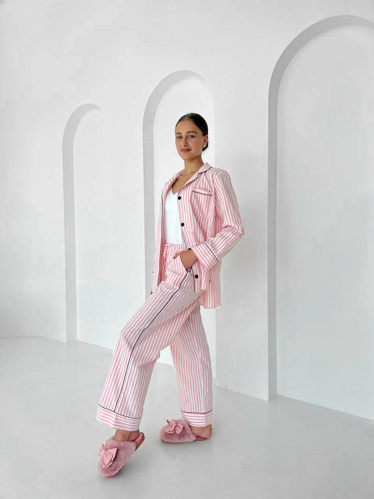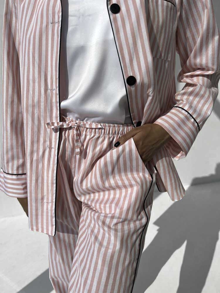 Жіноча піжама в полоску, колір рожевий з тканини штапель. Комплект сорочка довгий рукав і штани.