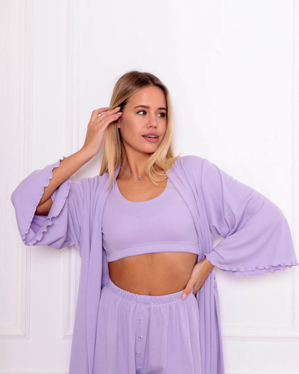 Жіноча піжама рубчик. Комплект 3 в 1 Халат Шорти, Топ. колір Ліловий. QC