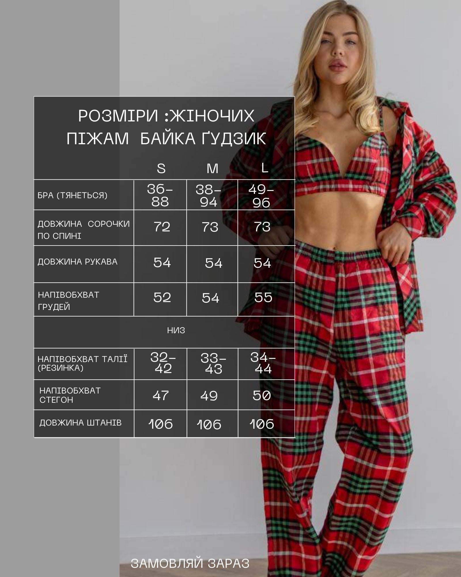 Жіноча байкова піжама в клітинку, 3 в 1 колір червоний з зеленим. Комплект сорочка довгий рукав і штани та бра (Size)