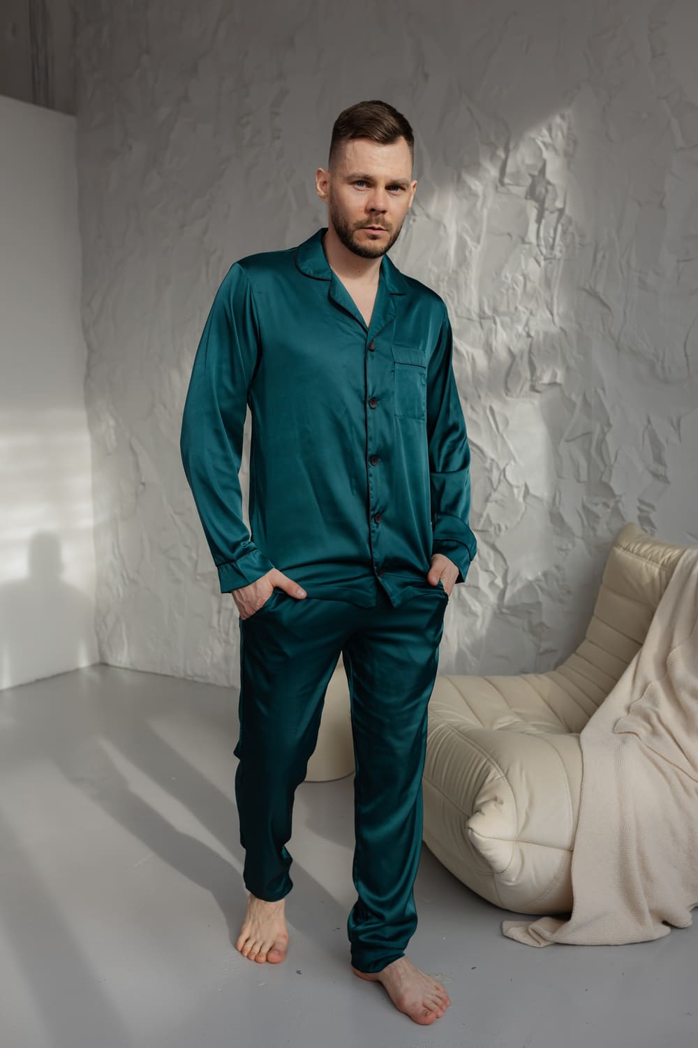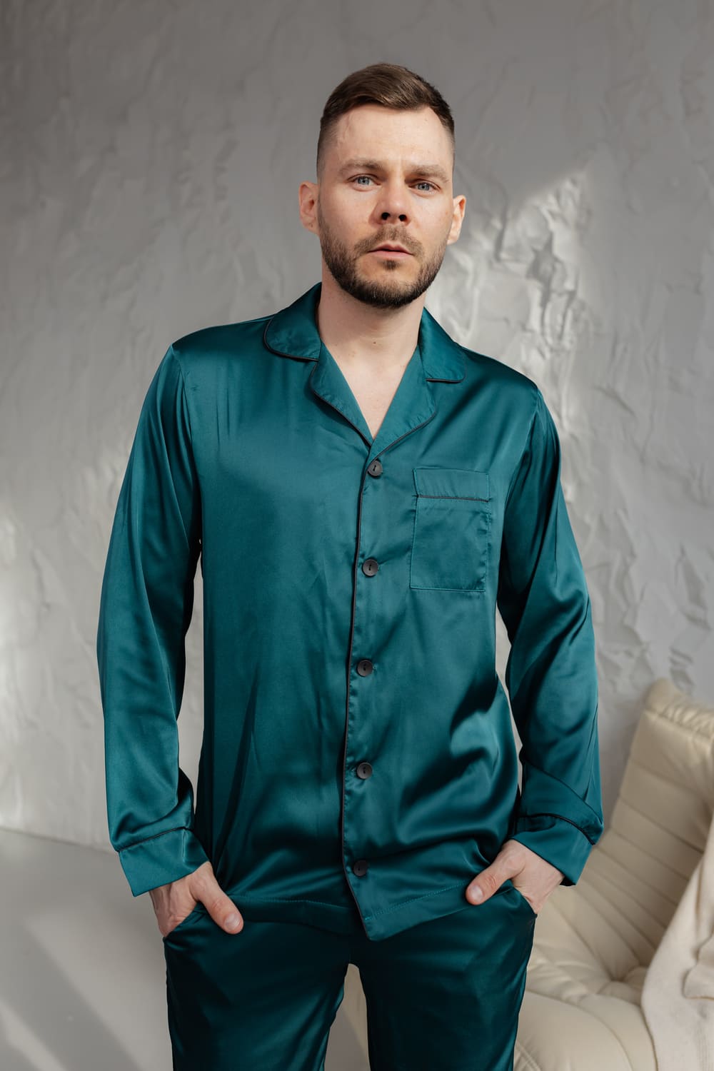 - Чоловіча піжама: комфортна сорочка на ґудзиках та зручні штани