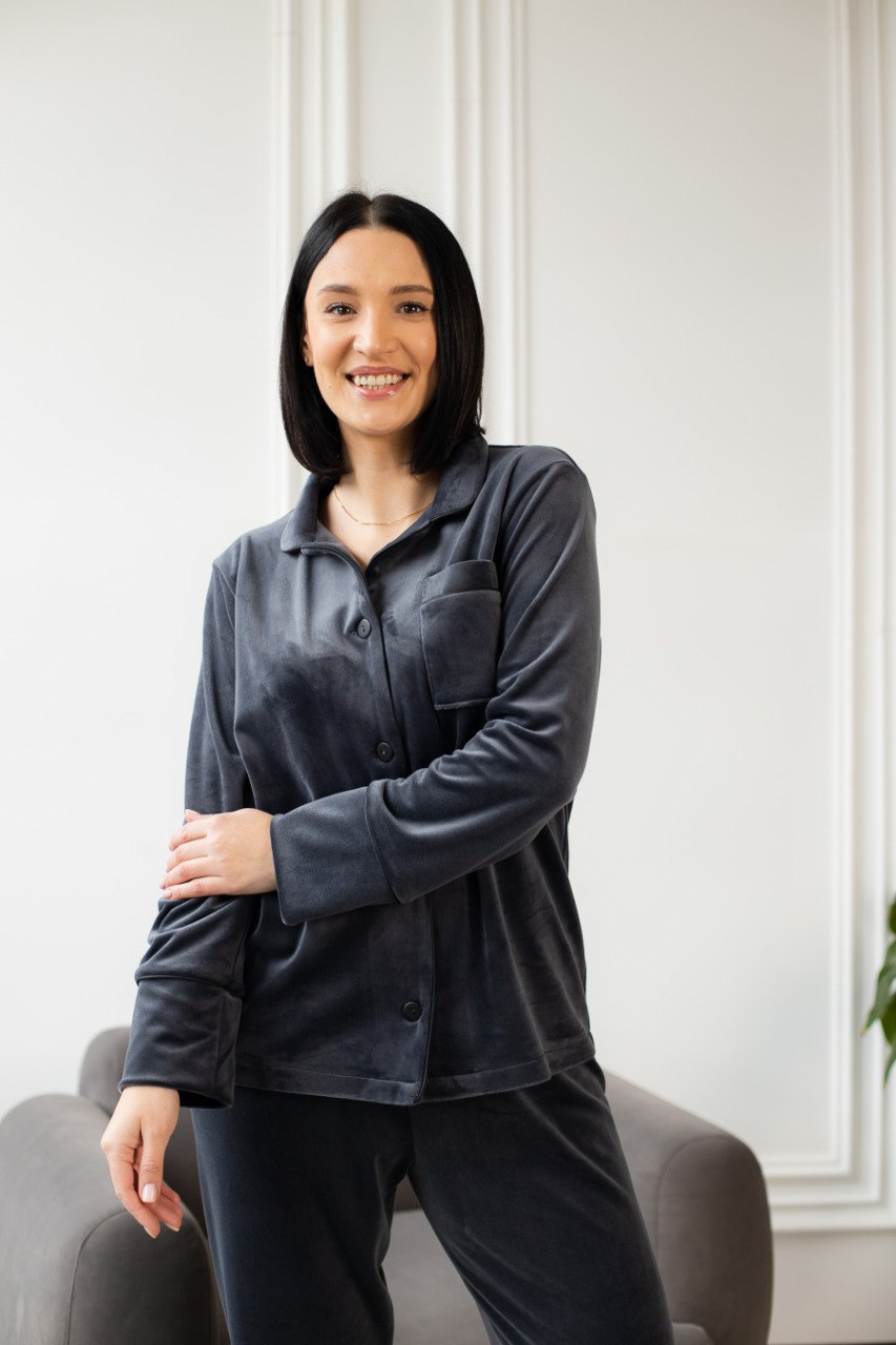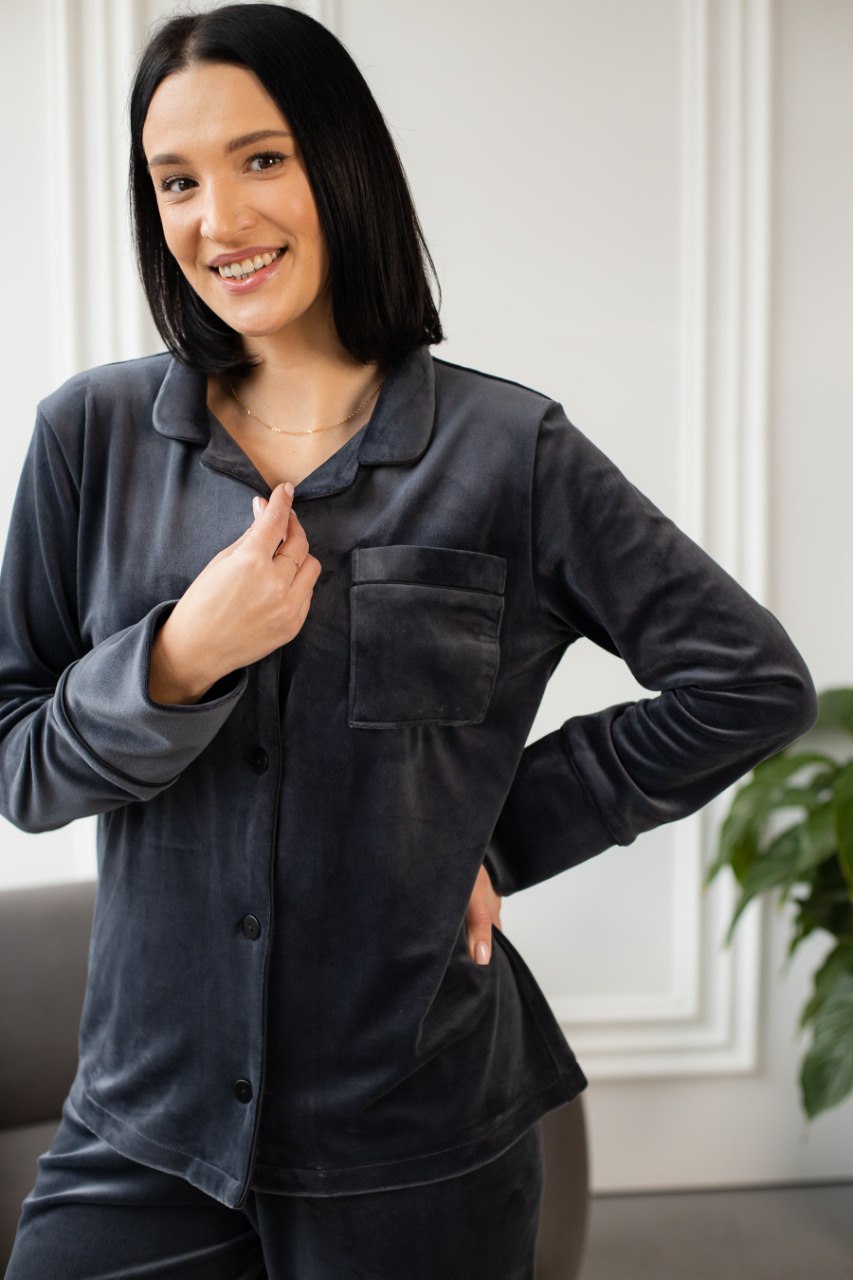 Пориньте у світ комфорту з нашою теплою жіночою піжамою з велюру-плюшу! Ця стильна піжама складається з штанів та сорочки на ґудзиках, що забезпечують не лише затишок, але й елегантний вигляд.