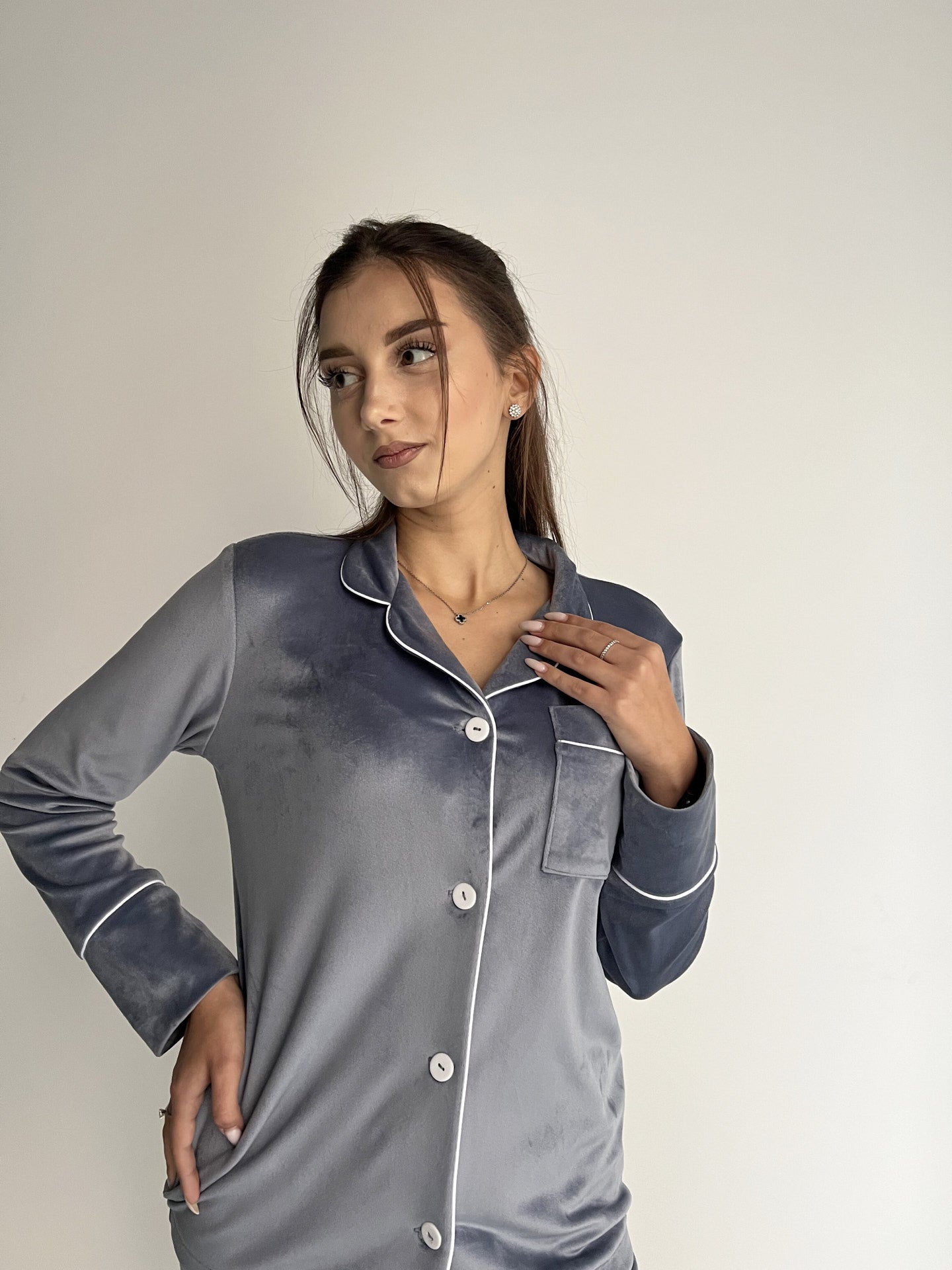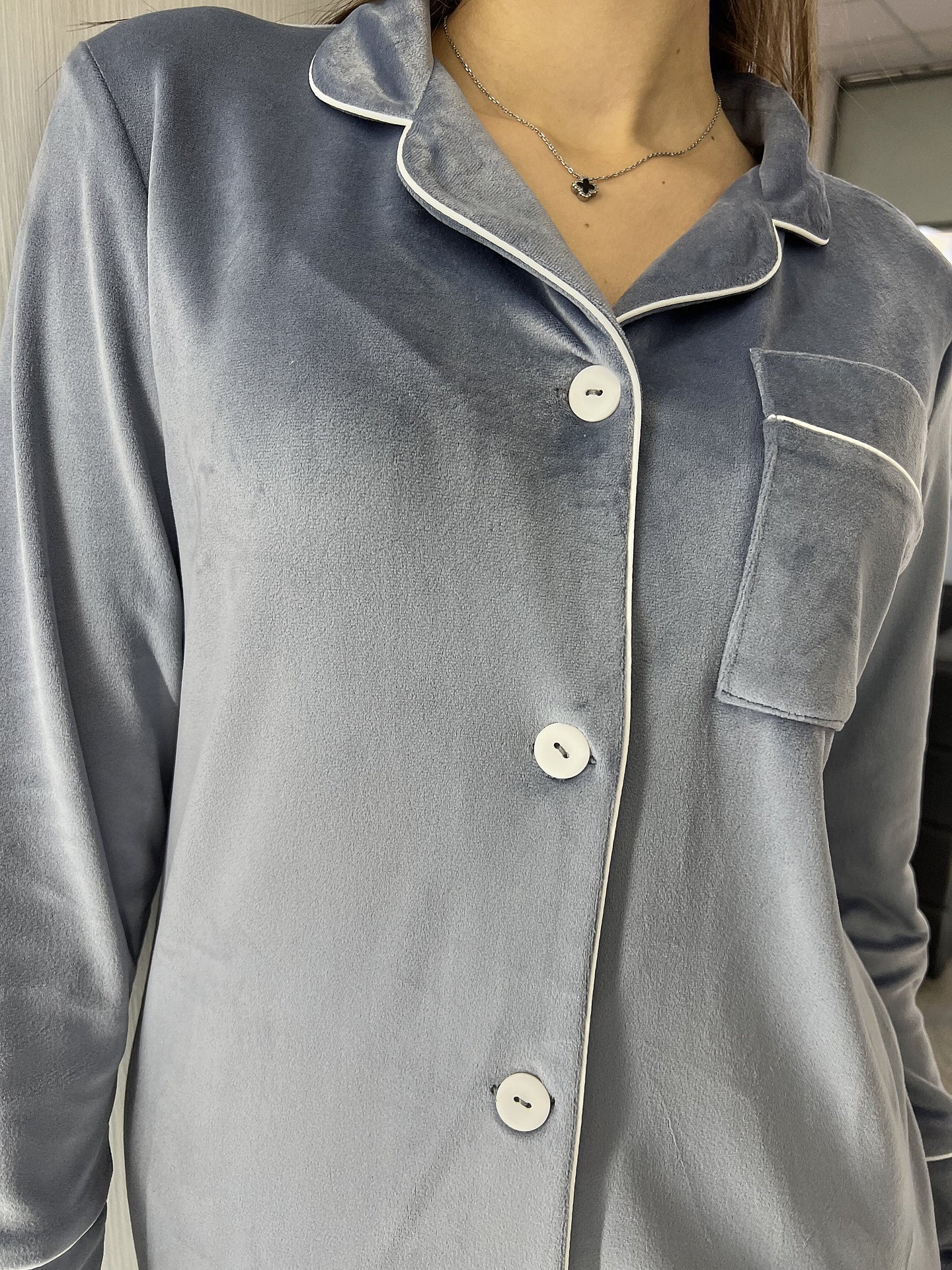 Відчуйте неймовірний комфорт і тепло з нашою жіночою піжамою з велюру-плюшу. Цей стильний комплект складається з елегантної сорочки на ґудзиках та зручних штанів, що робить його ідеальним вибором для холодних вечорів.