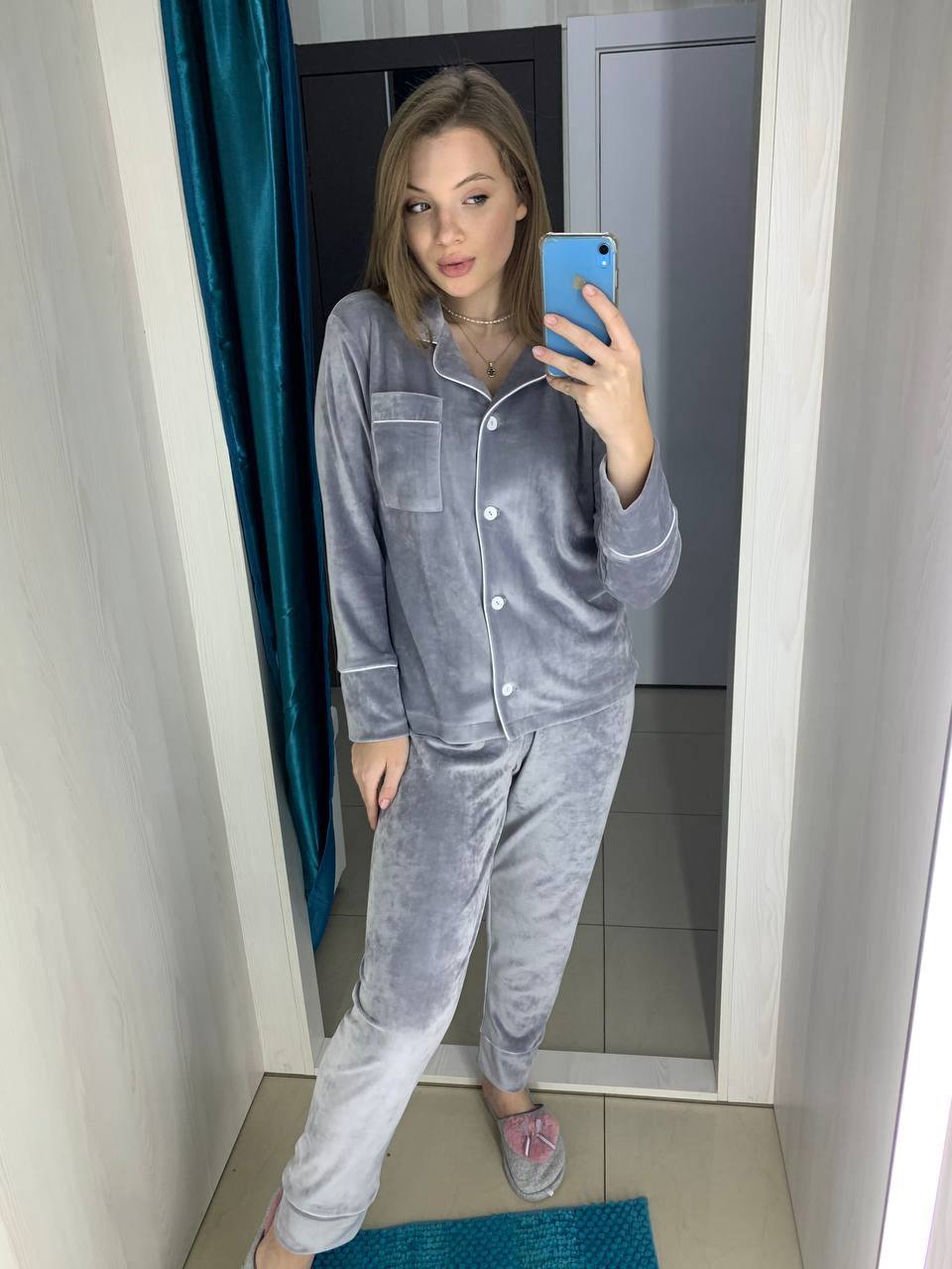 Тепла жіноча піжама Велюр плюш . Сорочка та штани . Колір Темно сірий